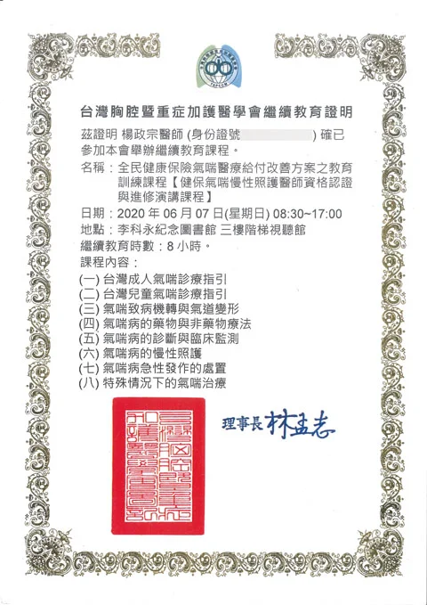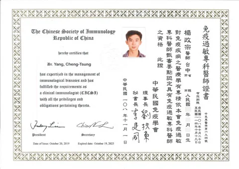 兒童過敏疾患:異位性皮膚炎診治(濕膚療法、生物製劑施打)、氣喘急性緩解與慢性保養、過敏性鼻炎保養與減敏治療、食物過敏之過敏原檢測與口服免疫療法諮詢、蕁麻疹之急性緩解與慢性控制 兒童預防保健與常見疾患之診治(呼吸道感染、腸胃炎等) 成人、青少年與兒童肥胖症之診治 成人與青少年睡眠呼吸中止症之診治